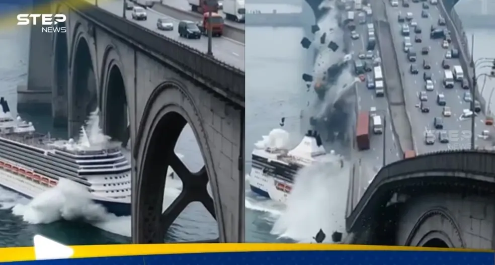 وأظهر الفيديو مشهدًا مضطربًا للحظة سقوط سيارات إلى الماء، بعد اصطدام الباخرة بالجسر.